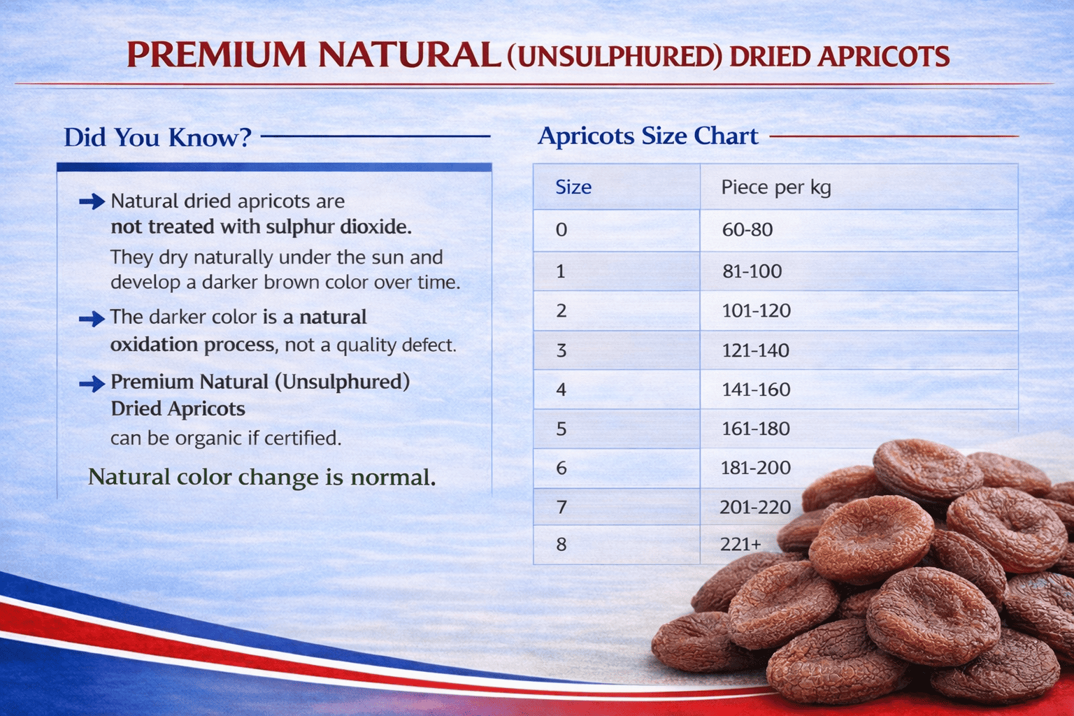 Premium Natural (Unsulphured) Dried Apricots sourced from Malatya, Turkey. Naturally sun-dried without sulphur, offering an authentic dark amber color, rich fruity taste and clean-label appeal.