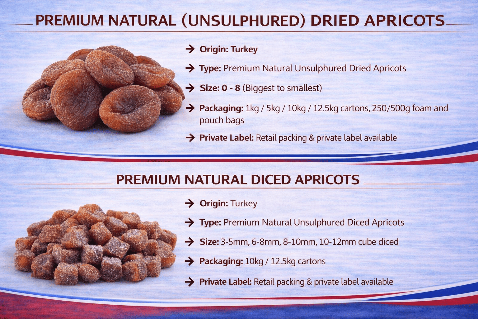 Premium Natural (Unsulphured) Turkish Dried Apricots are produced from carefully selected Malatya origin fruits and traditionally sun-dried to preserve their authentic flavor and nutritional value.